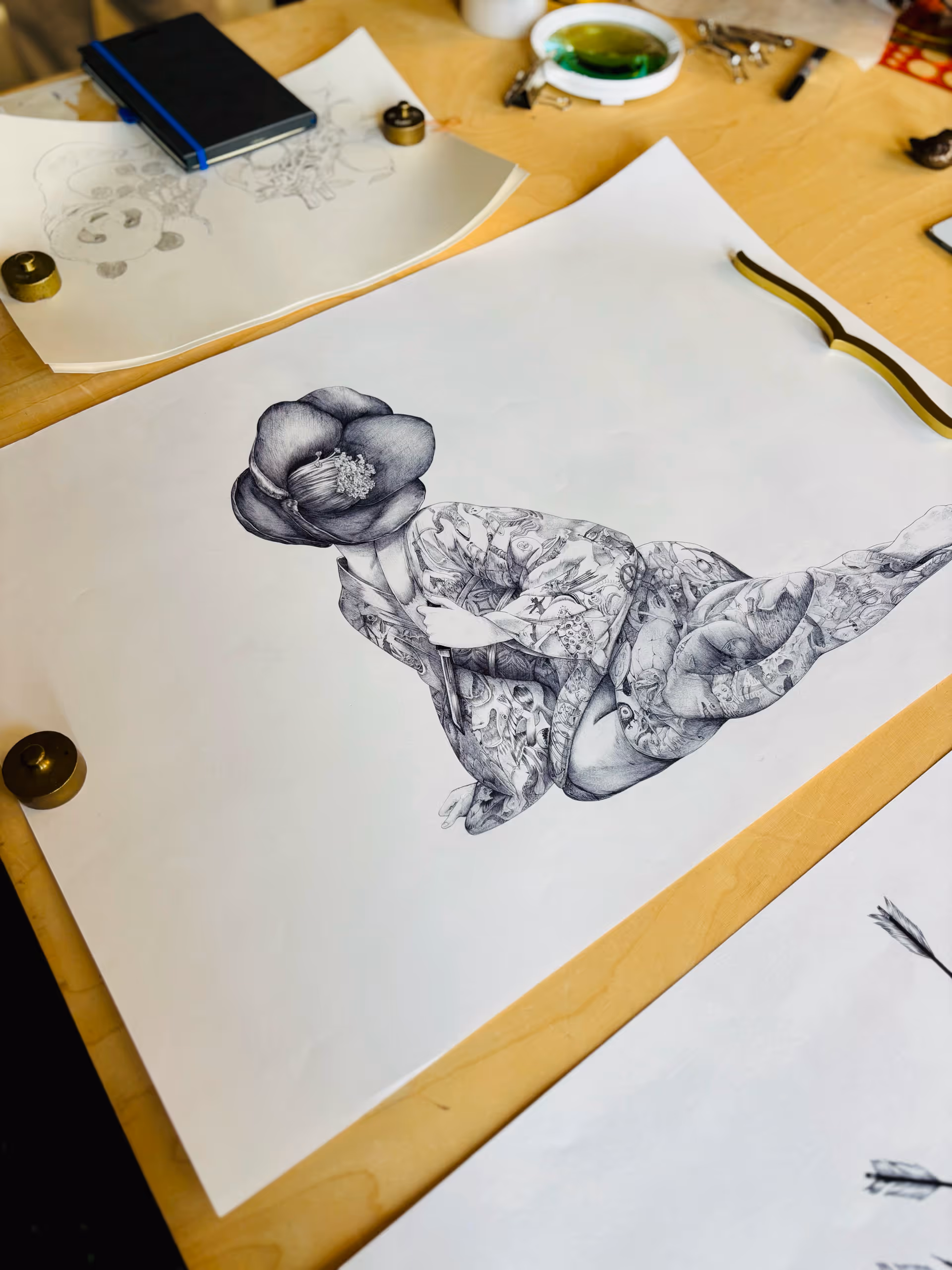 Seine Arbeiten sind geprägt von großer handwerklicher Präzision und einer reduzierten, klaren Bildsprache. Häufig entstehen detailreiche Zeichnungen und Kompositionen, in denen sich organische Formen, Tiere und ornamentale Strukturen miteinander verbinden. Die feinen Linien und sorgfältig ausgearbeiteten Details laden dazu ein, länger hinzusehen und immer wieder neue Aspekte zu entdecken.